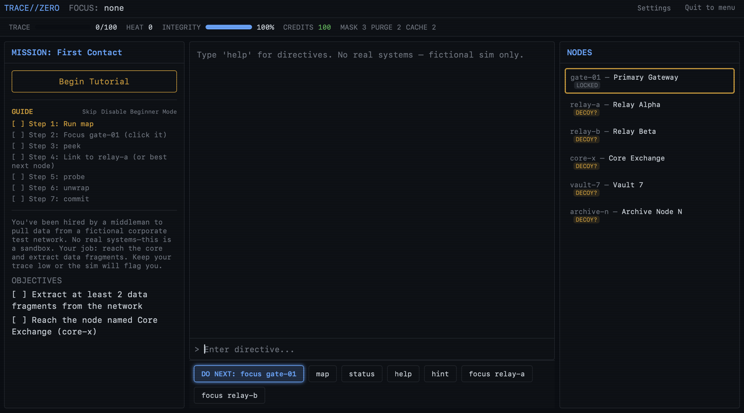 Well, it's interactive and decent but I have no idea what I'm doing lol. I am interested in making a hacking game myself and wanted to see what you did. I feel this is too close to a sim and without a background in this stuff it feels overwhelming. I found myself clicking everything with all these popus and having no idea what was going on. I got stuck on step 7 commit of the tutorial. For me, not enough hand holding with how esoteric the material is. I tried several times to reconnect the node to the relay then typing commit.